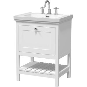 Rye Traditional Furniture Floor Standing 1 Drawer Vanity & 3 Tap Hole Fireclay Basin, 800mm, Cool Grey - Balterley Manufactured from high quality materials. The soft close drawer prevents slamming. The Fireclay sink is manufactured using a centuries old process and rigorously tested to the highest standard. Tap Waste and Fixings not included. A beautiful addition and focal point to your bathroom, the Rye range of traditionally inspired furniture from Balterley combines elegant design and quality materials. With 1 soft close drawer and an open slat shelf. In a beautiful Cool Grey super matt finish for a touch of the contemporary. Product Highlights A beautiful farmhouse inspired traditional vanity basin unit With 1 soft close drawer and 1 open shelf In a calming Cool Grey Super Matt finish With an elegant 3 Tap Hole Fireclay basin Ample storage to keep your bathroom clutter free Dimensions (mm): W 830 x H 865 x D 470 Product Weight (KG): 48 Manufacturer's guarantee: 5 year