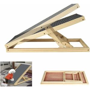 4 Adjustable Height: (Gradual Pet Ramp) The pet ramp can be adjusted to 4 heights -30 cm, 40 cm, 50 cm, 60 cm (11.8in, 15.7in, 19.7in, 23.6in). -Universal Height Adjustable Pet Ramp For Dog 1. Better slope angle design is convenient for young puppies, short-legged dogs(such as Corgi and Dachshund), injured dogs with limited mobility, and old dogs. And supports small, medium, and large pets up to 330 lbs. 2. Provides enough boost for pets. Perfect for small puppies, kittens or for older dogs and cats that need a little extra help to get up to their favorite resting spot. -Anti-slip, folding and portable The surface of the pet ramp comes with non-slip carpet, provide added comfort and safety for your pet, as the texture helps to prevent paws from slipping off. Lightweight foldable design, it is convenient to take it anywhere, use it anywhere. Easily store it in your trunk without taking too much space. -【Features】 -Strong Fir wood construction -Carpet surface helps with anti-slip
