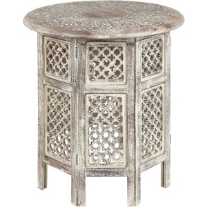 Mango Wood Side Table. This stunning piece will add character and charm to any room in your home. This table boasts a round top and a unique base that features carved openwork, giving it an elegant and intricate appearance. Crafted by hand from high-quality mango wood, this table is not only visually appealing, but it is also durable and built to last. The distressed effect adds a vintage charm to the piece, making it a perfect addition to any rustic or traditional décor style. Details: Product Type: Side Table Style: Retro General Color: Brown Material Type: Wood Main Material: Mango Wood Legs material: Wood Top Material: Wood Shape: Round Finish: Painted Storage: No Dimensions: Width: 53 cm Length: 53 cm Height: 53 cm Weight: 6 kg Weight Capacity: 15 kg Offer Includes: 1 x Side Table Key Features: Eye-Catching Accent Piece, Decorative Yet Functional, High Quality, Unique Handmade Piece, Exceptionally Low-Maintenance Assembly Information: Partial Assembly Required. 5-15 min.