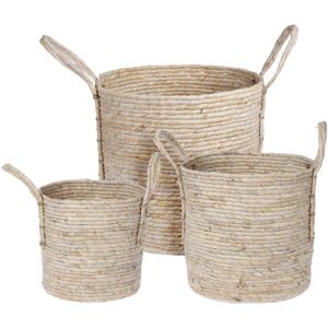 Enhance your living space with a contemporary feel through this set of wicker baskets, versatile for multiple areas within your home including the bathroom, bedroom, children's room, and kitchen. These baskets cater to both live and artificial plants, making them an ideal decorative addition. Corn Leaf Round Basket - Set of 3 Set of 3 Storage Baskets made from Corn Leaf Strapped for space? This set of 3 corn leaf baskets are perfect for storing toiletries, makeup, jewellery, keys and many other uses around the home. Strong and durable, they have been created to last for years and will make a great stylish addition to a plastic free, zero waste home. Did you know that these wickers are perfect for holding bigger house plants as it adds that little something to make plants look more appealing. Material: Corn Leaf Set of 3 baskets: Large: 330 x 330 x 330mm Medium: 280 x280 x 280mm Small: 240 x 240 x 240mm