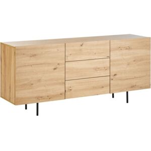 2-Door Cabinet with Drawers. Enhance your living or dining space with this elegant and functional sideboard. The body, legs, and top are crafted from robust pine wood, ensuring long-lasting quality, and the handles are made of zamak, a durable zinc alloy. Featuring a timeless combination of white and natural wood, it complements both modern and traditional interiors. Four spacious drawers and two generously sized compartments provide ample storage for dinnerware, linens, or household essentials, keeping everything organized. The sturdy top offers a perfect spot for decorative accents or serving essentials, making this sideboard a stylish and practical addition to any home. Details: Product Type: Sideboard Style: Scandinavian General Color: White, Silver, Brown Material Type: Wood Main Material: Pine Wood Additional Material: Zamak Legs material: Wood Top Material: Wood Doors Opening: Standard Drawers: Yes Finish: Clear Varnish Leg Caps/ Pads: No Number of Doors: 2 Number of Drawers: 4