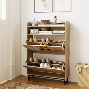 The shoe cabinet offers clever hidden storage with 2 flip drawers, each with a 2-level adjustable divider for personalized organization. On top, there is extra storage space with an anti-falling barrier and an open compartment for added convenience. Built on a sturdy metal frame for stability, it comes with an anti-tipping kit and protective foot pads. The cabinet's charming farmhouse look, crafted from well-woven PE rattan, complements various interior designs. Measuring 80 x 24 x 115 cm, it is versatile and perfect for entryways, living rooms, and bedrooms. 17 Stories