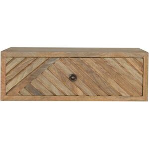 This minimalistic floating shelf has been constructed from 100% solid mango wood in an oak-ish finish and features 1 line carved design drawer with a shiny brass knob. This piece is perfect for storing any bits and pieces you wish to keep close by before bedtime. It's neat and clean design can easily be mounted on the wall without the fuss of any legs. Caution! Do not sit on the unit. Union Rustic