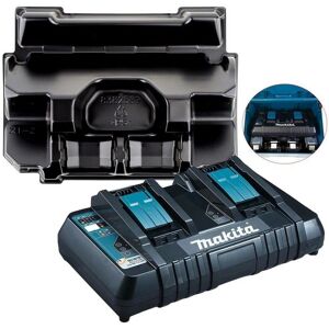 The DC18RD Dual port charger is capable of charging two Makita 18V batteries, simultaneously, and it will recharge both in the same time as with their actively cooled rapid charger. The range of Makita machines utilising two 18v Lithium-Ion batteries to generate a mighty 36v of power is expanding quickly. Therefore the new twin-port fast charger that takes just 22 minutes to fully charge two 18v 3.0Ah batteries will prove invaluable. This new twin-port charger will charge two 4.0Ah batteries in 36 minutes. With an LED charging display, and full charge audible alert, the Makita DC18RD fast charger has a forced cooling system for battery protection and a built-in electronic current limiter for overload protection. Includes an inlay for Makpac 3 cases that will hold the DC18RD charger .