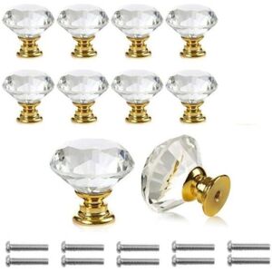 Material crystal glass + electroplated zinc Diameter 30mm Elegant style, easy to install, very good choice to decorate your closet cabinet drawer. Package includes 10 x crystal diamond diamonds. 10 x Screws Types of use Apply to furniture, bookcases, doors, dressers, drawers, cupboards, wardrobes, kitchens, storage, etc.