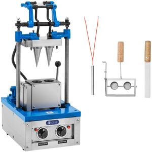 You serve ice cream cones non-stop? Then the Royal Catering ice cream cone machine is the ideal addition to your business. With it, you bake 4 identical ice cream cones in 1 - 2 min. Whether for the ice cream parlour, a café or the large kitchen - with the ice cream cone machine, you can secure ice cream cones according to your own recipe at any time! The croissant maker is very easy to operate: You can set the desired temperature for the upper and lower baking plates separately on the clearly arranged thermostats. Fill the moulds of the lower baking tins with the pre-made batter. Then press down the upper part with the help of the handy lever. The ice cream cone maker works with powerful 4200 W. The high power speeds up the baking process so that the croissants bake in just 60 - 120 seconds. After baking, separate the lower baking plates with a lever so that the finished croissants fall into a container; With 4 croissants in one run, you will achieve a throughput of 100 - 120 crispy waffles per hour. Your advantages: The ice cream cones are all perfectly formed and have the same shape, every time they are baked. You also decide which ingredients go into the waffle batter. The waffle croissant machine has a high-quality finish, making it robust and suitable for regular use. They are also easy to operate and clean in no time at all. Simply sweep off the dough residues from the easily accessible baking plates.