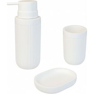 With this 3-piece bathroom set, you can furnish your bathroom with a cohesive look. The perfectly coordinated bathroom accessories include a toothbrush holder, a refillable soap dispenser for liquid soap, and a soap dish for bar soap. The bathroom accessories are made of durable and easy-care synthetic resin. Visually, the items impress with their elegant stone appearance and ribbed surface. Bathroom accessories in detail - Soap dispenser H x D: approx. 17 x 6.5 cm - Soap dish H x W x D: approx. 2.5 x 14 x 10 cm - Toothbrush holder H x D: approx. 10.5 x 7 cm - Material: polyresin - Available in various colours Stone-look bathroom accessory set - 3-piece bathroom set for a cohesive look in the bathroom - Refillable soap dispenser and tray for solid soap bars - Cup for storing toothbrushes or rinsing your mouth - Elegant bathroom accessories in stone appearance with ribbed surface - Bathroom items made of durable and easy-care synthetic resin Included in Delivery - 1x soap dispenser