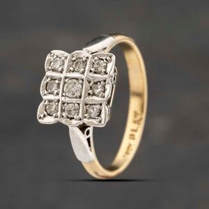 Vintage Yellow Gold 0.21ct Diamond Nine Stone Square Cluster Ring This item has no hallmark but tests as 18ct Width: 9.3mm Weight: 3.1g Diamond Carat: 0.21ct Pre-Owned Jewellery is a diverse collection made up of unique, one-off pieces. All of our items are assessed by our team of experts and we are constantly working hard to ensure we bring you the very best quality and value. Each piece also comes with our 12 month warranty for your peace of mind. Click here to view our entire Pre-Owned collection Alternatively, to make enquiries or view items in person please call or visit your local T.H. Baker store. Click here to find your nearest store