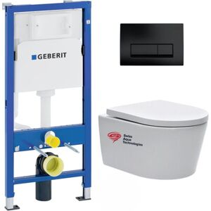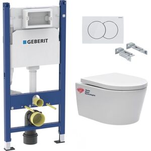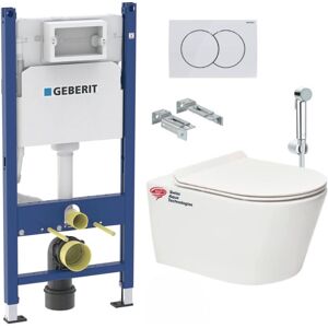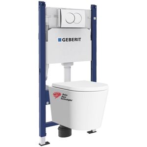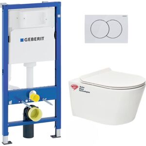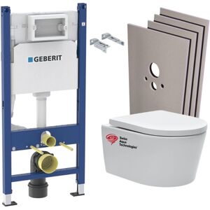 GENERAL DESCRIPTION The Geberit Toilet Pack includes a Duofix Frame, a Brevis Rimless Toilet, an ultra-thin soft-close seat, and a white flush plate. This set is designed for easy installation and modern aesthetics. TECHNICAL SPECIFICATIONS Geberit DUOFIXBasic for wall-hung toilets with Delta cistern (111.153.00.1) For drywall construction Installation in part- or room-height prewall installations Compatible with wall-hung toilets according to EN 33:2011 Projection up to 62 cm Floor constructions 0–20 cm Concealed cistern fully insulated against condensation Adjustable large flush: 4.5 / 6 / 7.5 L Fixed small flush: 3.5 L Water supply connection on rear or top center Installation depth: 12 cm Flush volume factory setting: 6 / 3.5 L COMPATIBILITY AND ACCESSORIES 2 M12 threaded rods for ceramic fixing Drain valve for 2 flush volumes Protection box for service opening Angle stop valve R 1/2' with adaptor ring Geberit AquaClean water supply hose Connection set for toilet, ø 90 mm