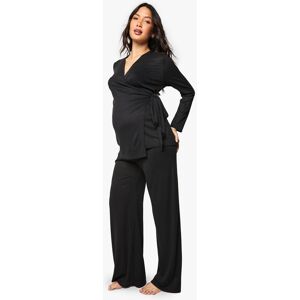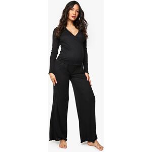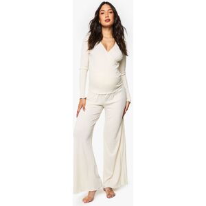 Ribbed maternity loungewear set featuring a collared top and wide-leg trousers Relaxed fit design with ample room for growing bump Soft ribbed texture for enhanced comfort during rest Elegant collar detail adds a refined touch to nightwear Wide-leg trousers with comfortable waistband for unrestricted movement This sophisticated maternity loungewear set combines style and comfort for expectant mothers. The ribbed texture creates a flattering silhouette while providing the stretch needed to accommodate your changing body. The collared neckline adds a touch of elegance to your nightwear collection, making this set perfect for both sleeping and relaxing at home. The wide-leg trousers offer unrestricted movement and comfort, essential during pregnancy. Pair with cosy slippers for the ultimate lounging experience, or throw on a lightweight dressing gown when answering the door. This versatile set will become a staple in your maternity wardrobe, offering the perfect balance of comfort and style during this special time.