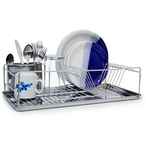 No need to dry dishes after washing them with this drying rack! Save time and exert less effort with this dish rack. It even includes a cutlery basket and a drip tray. Plates, bowls and cups will have plenty of space in the roomy rack, and the cutlery basket can hold all forks, knives, spoons and other kitchen utensils. Water drains into the draining tray below, so you won't end up with puddles all over your countertop. This chic 3-piece dish rack is made entirely of chromed stainless steel which is easy to clean and convenient for travelling, camping, etc. No More Puddles From Drying Dishes • Crockery and fruit can air-dry without leaving a wet mess behind • No pooling water on your countertop thanks to the draining tray • Dish water will drain directly into the tray • Chic shiny metal • Ideal kitchen aid • Practical in the kitchen or on camping trips • Easy to clean and transport Details on XL Stainless Steel Draining Rack with Cutlery Basket • Size: approx. 48 x 33 x 12 cm (18.9 x