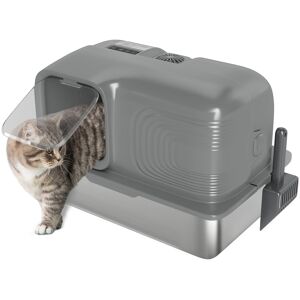 Keep your home fresh and cat's happy with PawHut cat litter tray! Equipped with a built-in plasma deodoriser featuring adjustable airflow and three fan speeds. The sealed stainless steel base prevents leaks and odours, making clean-up quick and easy. Smart infrared sensors detect when your cat enters or leaves, activating the deodoriser only after they're done – no surprises, just comfort and safety. This cat litter tray is great for cat owners who want a cleaner, smarter litter solution.- Plasma deodorizer with adjustable airflow and 3-speed fan settings; - Infrared sensor technology ensures safety for cats; - The sealed stainless steel base is leakproof and no lingering smells; - High-edge design prevents litter and waste from spilling out; - 65L spacious inner fits cats up to 10kg; - The front lid lifts for quick daily cleaning without disassembly; - Quick assembly needs 1 person 1 minute; - Equipped with 4 non-slip pads for stability;- Colour: Grey; - Overall Dimensions: 61L x 40.5W x 41H cm; - Material: ABS, Stainless Steel; - Capacity: 65L; - Door Size: 21.5L x 21.5W cm; - Scooper: 28L x 12W cm; - Assembly time: 1 person in 1 minute; - Adapter Input: 100–240V, 0.2A, 50/60Hz; - Adapter Output: 5V 1A; - Cable Length: 150 cm; - Plug Type: UK plug; - Item Label: D31-128V70GY; PawHut