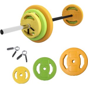 With this HOMCOM 20kg barbell weight set, your weightlifting journey starts here. It comes with three different weights – 5kg, 2.5kg and 1.5kg – so you pick a weight that's comfortable for you to lift. The bar is strong and rigid, with non-slip handles for a firm grip when exercising. The bench press bar and weights set also comes end fixings to keep the weights securely on the bar – they won't fall off at any point. Specifications: - Colour: Orange, green and yellow - Material: Metal, PU and sand - Dimensions: Փ28 x 130Lcm. 5kg plate: Ф28 x 4Dcm. 2.5kg plate: Ф23 x 3Dcm. 1.5kg plate: Ф18 x 3Dcm. Barbell bar: Ф2.5 x 130Lcm (fits weights with 2.5cm/1 diameter) Item label: A91-260V00MX Just so you know: this item ships and arrives in separate boxes. Delivery times may vary with each box. Box quantity: 2 Features: ● 20kg weight in total ● PU coating for protection – it won't damage your floor ● Non-slip grip, so you can firmly hold the bar when exercising ● End fixings included, so the