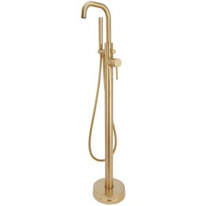 GENERAL DESCRIPTION This stylish Core freestanding bath shower mixer tap in brushed brass is a great addition to any modern bathroom. It comes with two handle options for a customizable look: a diamond cross-hatch detail or a sleek, smooth appearance. TECHNICAL SPECIFICATIONS Brushed Brass finish Operating 1.0 bar pressure Deck mounted Lever handle Round design WRAS approved Internal brass construction Dual lever handle controls both temperature and flow Height: 1097mm Length: 174.4mm