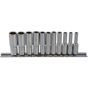 This Blue Spot socket set contains 11 useful 1/4 inch square drive sockets which are made from chrome vanadium steel and which have a deep reach for better access. The set contains the following sizes: 4, 4.5, 5, 6, 7, 8 ,9, 10, 11, 12 and 13mm. Supplied with a storage rack.