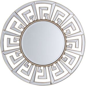 Decorative Round Mirror in Gold. This mirror perfectly beautifies modern and glam interior, thanks to its unique framing. Gold border of the Greek key inspired pattern featured on the frame adds a distinctive finishing touch. It looks stunning wherever it is placed: living room, in the bedroom or in the hall. A true embellishment, and the essence of 'classic glamour'. Details: Product Type: Decorative Mirror Style: Glam General Color: Gold Material Type: Glass Main Material: MDF Additional Material: Glass Shape: Round Finish: Gloss Dimensions: Depth: 3 cm Width: 70 cm Height: 70 cm Weight: 6 kg Offer Includes: 1 x Mirror Key Features: With Hooks on the Back for Hanging on the Wall, Enlarges Interior Visually, Decorative Yet Functional, Retro Style, Safe and Stable Mounting Assembly Information: Does Not Require Assembly Maintenance tips: MDF: 1.Clean with a mild cleaner and soft cloth, wipe dry afterwards 2.To avoid scratches do not use abrasive cleaners 3.For copper or chromed