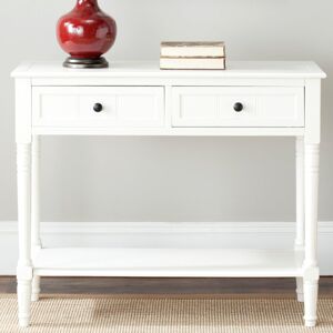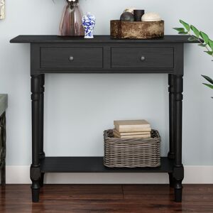 The modern functionality of this classic console table offers you loads of storage space, while its carved feet and slimline shape emphasize its elegant design. It is available in various colors to fit in with various interiors. Two deep drawers and a lower shelf offer loads of storage space. The table is made of sturdy, durable solid wood. The item requires assembly after delivery. Three Posts Colour: Aged Black