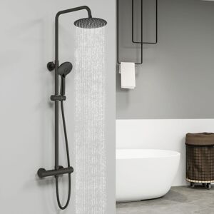 More details: Stylish, practical and safe Thermostatically controlled Separate controls for flow and temperature Solid brass construction Modern matte black finish Stainless steel riser system Round 200mm x 200mm drencher head and separate adjustable handset Adjustable Riser Rail Adjustable riser rail height from 720mm - 1250mm - suitable for any needs