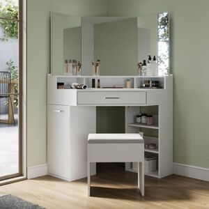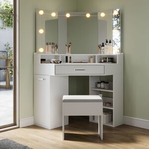 ELEGANT Corner Dressing Table with LED Mirror Lights, Left and Right Movable Triple Mirror, 3 Open Compartments and 2 Drawers, Perfect for Girls, Black This corner dressing table's compact design is a perfect space saver, perfect for small corners. It offers ample storage for makeup, jewelry, and other personal items, keeping your desk neat and organized. Three adjustable mirrors on each side provide a full view. Hollywood-style LED mirror lights provide bright, soft illumination, illuminating your makeup from various angles for a more precise and convenient application. This dressing table impresses with its elegant design, featuring a smooth, glossy black tabletop that radiates a simple and modern atmosphere. The frameless mirror design not only enhances the aesthetic but is also easy to clean, saving time and energy. Whether for makeup, dressing, or daily organization, it provides you with a comfortable and efficient workspace. Features ⭐【 Mirror light Multi-Mode 】
