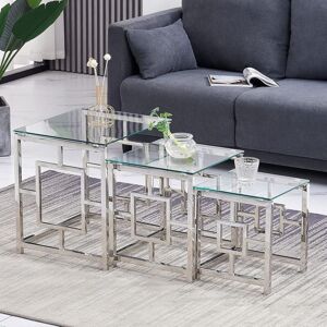 Two options: the matched 3-piece set, or a separate large coffee table. It can be used as a coffee table or as a side table, lamp table and storage table. The tabletop glass is tempered for safety, and the table is easy to clean with a damp cloth. The silicone gaskets on the iron frame absorb vibrations from the glass while keeping it firmly in place. The iron stand makes it very stable. The coffee table needs to assembly easily. Specifications Colour: Light gray glass , Clear Glass Material: 6mm Tempered glass + Metal Size 1 : 47 x 41 x 49 cm (L x W x H) Size 2 : 36 x 38 x 41 cm (L x W x H) Size 3 : 30 x 31 x 35 cm (L x W x H) Tempered glass thickness: 6 mmPackage including: 1 coffee table or 3pcs set(We will ship the goods according to your choice.) Note Please allow 1-3cm error. If you have any questions, please feel free to contact me. Put an end to medium and poor evaluation.