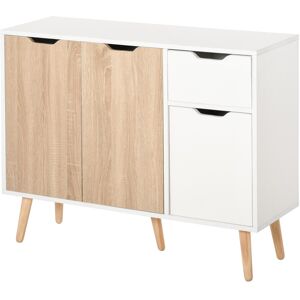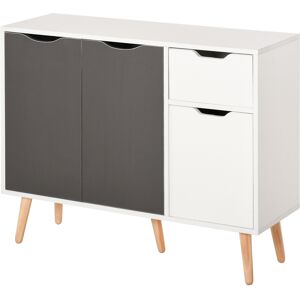 Keep your home stylish and the space tidy: look no further than this freestanding cabinet from HOMCOM. Cut to a clean boxy shape for simplicity, it comes with two large cupboards, one smaller cupboard and a top drawer, giving an abundance of handy storage. The white frame is clean, with the mix of white doors and coloured doors adding a unique point of difference so it stands out. Made from particle board, this piece is durable, finished with five wooden legs so it stands steady and back straps so it doesn't topple over.Features:Cut-out handles on drawer and cupboards, easy to open and closeSolid wood legs for balance, elevates the base for extra protectionClean Scandinavian style in boxy shape. White frame with white and coloured doors to stand outSuitable for use in the bedroom, dining room, study/office, garage and hallwayFlat top for open holding and display roomAnti-tipping straps for safetyMaximum load 50kg, assembly required