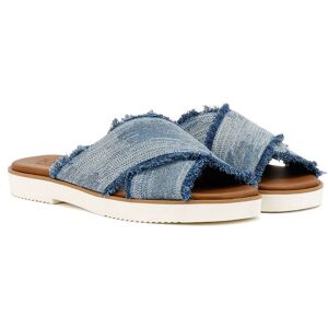 Step into effortless style with these denim cross-strap flat sandals. Featuring fray detailing straps and ultra-comfy custom CloudBound™ foam insoles for all-day cushioning and support. Finished with a lightweight EVA outsole and sawtooth detailing for added grip and style.