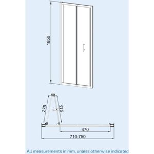 Made from 1 mm aluminium profile and coated in a stunning chrome finish along with stainless steel handles. The glass panels on the shower enclosure are created from 6 mm tempered clear glass. All our bi-fold folding shower doors and glass side panels are delivered with a 10-year Warranty. Bi-Fold Glass Shower Door Specifications Height: 1850 mm Width:710-750 mm Concealed design bi-folding shower enclosure cubicle door The bi-folding door is manufactured from 6mm toughened tempered safety glass Highly durable and easy to clean glass coating Dazzling chrome finish profile Strong build push release double rollers for smooth operation Quick release door system, easy removable wheels for easy cleaning High quality stylish stainless-steel handles, polished chrome finish Quality finish ensuring long term durability Chrome plated metal seal strip Passed multi waterproof tests - the best waterproof guarantee Power shower proof Universal; left or right hand fitting 40mm out of line inward wall