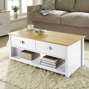 The Easton White Coffee Table in a white finish features a solid hardwood construction with a natural oak top. This sturdy coffee table includes two storage drawer with a wooden runner and a maximum tabletop weight capacity of 91 kg. The unit measures 45 cm in height, 100 cm in width, and 60 cm in depth. The tabletop is 4 cm thick. Assembly is required. Key Product Features: Coffee table with a handy storage drawers Finished in White with a Natural Oak top Made from durable hardwood Dimensions: (W)100cm (D)60cm (H)45cm Features a 4 cm thick tabletop Supports a tabletop weight of up to 91 kg Requires home assembly Home Source White Coffee Table 2 Large Storage Baskets & 2 Drawer Solid Oak Top