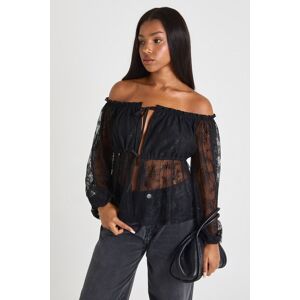Boohoo Womens Lace Bardot Tie Front Blouse - Black - Size 10 Uk