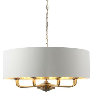Specification Endon Highclere Single Shade Pendant Ceiling Lamp, Antique Brass Plate, Vintage White Fabric Finish: Antique Brass, Vintage White Fabric Material: Fabric, Steel IP Rating: IP20 Min Height: 35cm Max Height: 174cm Diameter: 55cm Lamp Type: E14 No. of Lamps: 6 Bulb Included: No Dimmable: Yes - Dimmable Bulb Required Weight: 2.2 Wattage (max): 40W Description The Highclere multi arm pendant is a sophisticated mix of vintage white fabric shade lined with gold metallic inner and antique brass plated metalwork. This statement light is the perfect timeless addition to modern and classic homes of today.