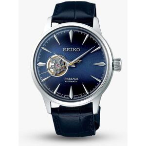 Combining elegance with craftsmanship, this watch features a deep blue dial. Made from stainless steel, the watch features a transparent case back revealing the intricate automatic movement within. Finished with a soft matching blue leather strap, it blends timeless style with Seiko's renowned precision, making it a captivating choice for both formal occasions and everyday wear. • Powered by the automatic movement with 24 jewels and a power reserve of up to 41 hours. • Presented on a blue leather strap with traditional buckle. • Hardlex glass. • 40.5mm case width. • 50 metre water resistance.