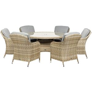 WENTWORTH 6 Seater Round Imperial Dining Set 140cm Table with 6 Imperial Chairs including Cushions. The Wentworth 6 seater Imperial Dining set is the perfect addition to your outdoor space with its timeless design. Retaining classic style with its aluminium framework and hand woven, synthetic, half round rattan weave, it offers style, comfort, strength and durability. Complete with a round tempered glass top table and six imperial chairs including weather shield seat and back cushions, it is perfect for a relaxing, comfortable dining experience. Features: Material: Synthetic Rattan Main Colour: Beige Cushion Colour: Grey Rust Proof Aluminium Frame Tempered glass table top complete with parasol hole Shower and stain resistant cushions included Practical and space saving design Compliments any outdoor living space Set Includes : 1 x Round Table (with tempered glass top) 6 x Imperial Chairs 12 x Weather shield cushions Assembled Dimensions: Table: H74cm W140cm D140cm Chairs: H90cm W72cm