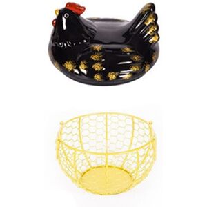Country style metal egg basket with lid. Features an adorable hen perched on a wire basket, a fun yet functional way to store your eggs. Two iron handles allow you to easily carry this lovely chicken and egg basket. Color: Black + Gold Material: Ceramic + Iron Size: 19.5 x 22 cm Package Contents: 1 x Egg Storage Basket Only the above package content, other products are not included. Note: Light shooting and different displays may cause the color of the item in the picture a little different from the real thing. The measurement allowed error is +/- 1-3 cm.