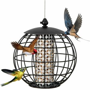 Perfect Gift for Wild Birds! Our squirrel-proof metal bird feeder is equipped with a spherical metal net, which can play as a protective pole while providing more space for bird habitation. It can attract a variety of birds, such as cardinals, mockingbirds, chickadees, goldfinches, bluebirds, etc. Thus you can also enjoy hours of birding fun. Besides, constructed of high-strength sprayed metal and adopting a rustproof stainless steel wire, the wild bird feeder can be used in different weather. And with the round tray, it can catch scattered seeds, making the wild bird feeding more natural. When it empties, all you need to do is open the lid and refill new seeds. You can hang it on the tree, eave, or pillar according to different needs. Features: Made of heavy-duty sprayed metal, sturdy, durable, rustproof, weatherproof The drainage holes can prevent rainwater from soaking the bird food Designed with a large bird feeder to hold a variety of seeds The round tray design allows multiple