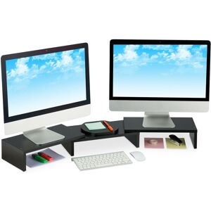 This monitor stand for the desk keeps the workplace tidy and ensures an upright, ergonomic sitting posture. The monitor elevation made of bamboo has 2 drawers and 3 shelves that provide enough storage space for pens, books, notepads and more. 2 screens can be placed on the extendable desktop stand, the angle of the side shelves can be adjusted individually. Keyboards or documents can be stored under the PC shelf to save space. Bamboo Monitor Stand Details - Extended dimensions H x W x D: approx. 11 x 107 x 22 cm - Dimensions when folded H x W x D: approx. 11 x 60 x 22 cm - Max. Max. load: 8 kg per upper shelf - Weight: approx. 3.8 kg - Material: bamboo, MDF - Colour: natural Screen Stand For 2 Monitors - Space under middle shelf H x W x D: approx. 3 x 56 x 22 cm - Space under outer shelves H x W x D: approx. 4 x 23.5 x 22 cm - Drawer interior dimensions H x W x D: approx. 4 x 26.5 x 19 cm Practical Screen Riser - Individually adjustable and suitable for up to 2 screens - Practical