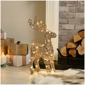 Festive LED Lit Battery Operated Champagne Gold Reindeer - 55cm This LED Lit Battery Operated Champagne Gold Reindeer - 55cm is ideal for enhancing your home this festive season. Fully illuminated with warm white LEDs this cone tree creates a soft glow that contrasts beautifully with the woven design. Battery operated (3x AA not included). Description Festive LED Lit Champagne Gold Reindeer 40 micro LEDs Warm white lights Indoor use Battery operated Size: 55cm