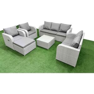 • This deluxe reclining rattan sofa set is a great addition to patio or garden, made of high quality PE rattan and durable galvanized steel construction for sturdiness and long lasting.Durability ,and can be put outdoor all year round. Perfect set to sit round with your family and friends. • Set Dimensions: • 1 x Love Sofa : 124W x 67D x 79H cm • 1 x Black Tempered Glass Table :140L x 80W x 70H cm • 2 x Reclining Chairs: 74L x 67W x 79H cm • 1 x Footstool: 65L x 65w x 34H cm • Dark grey mixed rattan with dark grey fabric .Color may some difference due to light or monitor .we are unable to return the item due to color problem . The 2 armchairs are adjustable, you can adjust the inclination of the chair back from 90°-130° through the button . • Items Comes Flat Packed And Easy Assemble,Sturdy Galvanized Steel Tube Metal Frames With Powder Coating To Prevent The Rust, Ergonomic High Back And Declining Design For Extra Comfort. • 8 CM Thick Seat Cushion And Without Back Cushion As Per