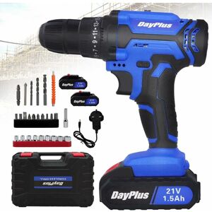 Two 1500mAh Lithium-lon battery charges 1.5 hour charge time reduces project delays so you can finish without delay! 26 Piece Accessory Kit includes all the necessary drill bits, ideal for everyday screwing tasks. Drill stands firm on it's base so you can grab it and get started. 25 + 1 torque selector slip control ring prevents over tightening or stripping of screws or over-drilling. LED lights help in dim places with little lighting. Specification: Rated Voltage: 21V Size: 32*9.5*25.7cm Weight:2.6kg Max torque(Hard tightening application):45Nm Battery: 2 x 1500mAh Lithium-lon Speed: 0-400rpm/0-1400rpm Max drilling capacity (wood): 23mm Max drilling capacity (steel): 10mm Torque setting:25+1 Chuck diameter: 0.8-10mm Max torque diameter:6mm Charge Time: about 1.5Hrs (100%Battery) Working time: about 1.2Hrs (100%Battery) Package Includes: 1 x Blue Cordless Screwdriver with 2 batteries 1 x English User Manual 5 x Drill bits 10 x Screwdriver Bits 1 x Double Ended Bits 9 x Sockets 1 x
