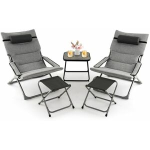 Transform your outdoor space into a cozy and comfortable area with this 5 piece patio sling chair set. Perfect for balconies, backyards, gardens or even the beach, this all-inclusive set is everything you need for ultimate relaxation. Featuring two folding sling chairs complete with ottomans and a matching coffee table, this set will make you and your friend fully relaxed. The removable seat cushion and headrest combo provides an extra layer of comfort. What’s more, with heavy-duty metal frame, the 5 pieces can withstand strong load. And the folding and portable design allows you to easily store or transport the patio set. Elevate your outdoor lounging experience with this sling chair set! Features: Enjoy optimal comfort and softness with cushion and soft headrest pillow Sit with coolness when the cushion is removed Hook and loop fasteners prevent cushion from moving around Back pocket offers extra storage space Reinforced metal frame for high-level stability Coffee table with SPC