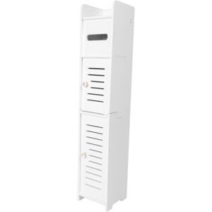 [Perfect Toilet Paper Dispenser]This bathroom toilet paper storage cabinet with two door and shelves modern design, provides much storage space in your tiny room. This toilet paper storage cabinet can use for 4-5 rolls toilet paper (normal size) one-time storage. A sleek bathroom organizer as a toilet paper dispenser. [Perfect Slim Design for Small Spaces]Our small bathroom storage fits anywhere of your house, about small size 6INCH W x 6.4INCH D x 30INCH H can fit any tight spaces, it's the perfect size to exploit the tight space a small bathroom features. This sleek slim & space-saving design storage cabinet can not only use as a bathroom storage cabinet, also suitable for bedroom and living room organizer. [Safe and Reliable]This small bathroom cabinet made from PVC, non- paint, waterproof, flame-retardant, , easy to clean, convenience for family use. [Bathroom Storage]The of this bathroom storage cabinet is great for holding corner plant stand or a cell phone, the open shelf