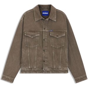 Make a versatile addition to your casual wardrobe with this jacket by HUGO Menswear. Crafted in dark-blue raw denim. Hem adjusters, signature trims. This product's raw material is derived from regenerative agriculture: an approach focused on preservation and restoration that aims to increase biodiversity, preserve water quality and improve soil health while absorbing CO2. Regenerative agriculture also promotes animal welfare and fair working conditions for farmers.Features:- Regular fit- Shirt Collar- Flap chest pockets- Pockets top: Welt pockets- Button cuffsSpecifications:- Material: 100% Cotton, pocketing: 100% CottonCare:- 30°C mild fine wash- Do Not Bleach- Do Not Tumble Dry- Iron Medium Heat- Do not chemical dry clean
