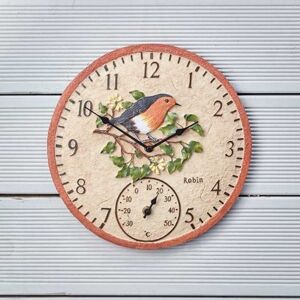 Garden Wall Clock with Thermometer & Hygrometer Traditional indoor or outdoor clock with barometer, thermometer and Roman numerals. Finished off in an attractive style these clocks are hardy and can deal with whatever the weather throws at them. Features: Roman numbers and skip hand movement. Weather resistant with Centigrade & Fahrenheit reading. Includes hygrometer and thermometer. Plastic construction. Diameter: 15 inches. For both indoor and outdoor use. Powered by 1x AA battery (not included).