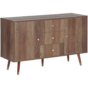 Rustic Cabinet with Drawers. The stylish sideboard with two capacious compartments and three drawers will help to keep your interior tidy and well-organized. The chipboard and MDF in dark oak colour go well with subtle, metal handles and slender, wooden legs. Inspired by the retro style, the cabinet is perfect for both living room and bedroom. Details: Product Type: Sideboard Style: Traditional General Color: Brown, Gold Shade: Dark Brown Material Type: Wood Main Material: MDF Additional Material: Metal Legs material: Wood Top Material: Engineered Wood Doors Opening: Standard Drawers: Yes Finish: Paper Veneer Leg Caps/ Pads: Yes Number of Doors: 2 Number of Drawers: 3 Shelves: Yes Dimensions: Depth: 40 cm Width: 114 cm Height: 71 cm Weight: 33 kg Drawer Weight Capacity: 5 kg Shelf Weight Capacity: 5 kg Top Weight Capacity: 40 kg Offer Includes: 1 x Sideboard Key Features: Practical Drawers with Stable Mechanism, Retro Style, Wood-like Finish for Natural Look, Functional Deep Storage