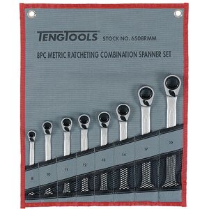 The Teng 6508RMM Combination Spanner Set contains 8 professional quality, 72-tooth ratchet combination spanners, each with flip reverse action for changing direction. Supplied in a handy storage wallet. Contains the following sizes: 8, 10, 11, 12, 13, 14, 17 and 19mm.