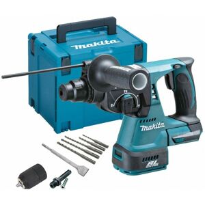 The DHR242 tool body is separated into the upper and lower housings at the foot of handle portion where the housings are jointed with vibration absorbing cushion rubbers. Higher productivity than model BHR202 achieved by using efficient Brushless DC motor to reduce energy loss by 30% Unique rubber joint construction suppresses the transmission of vibration to battery terminals, minimizing battery failures such as terminal breakage or poor electrical contact. Able to drill in concrete as fast or faster than 24V Cordless Combination Hammer model BHR200. One touch slide chuck for SDS-plus bit. Easy-to-grip handle ergonomically designed to: • give maximum power thrust. • provide a sure and comfortable grip in any operation; overhead application, drilling with palm-up or palm-down grip. 3 mode operation • Rotation + Hammering • Hammering only • Rotation only Included in this set: DHR242Z Brushless SDS Drill 17 Piece SDS Set + Chisel Keyless Chuck SDS Chuck Adaptor This is a bare tool only
