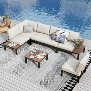 Elegant & Comfortable: PHI VILLA garden furniture sets are designed with thick seat and back cushions, providing you with exceptional comfort while you enjoy your leisure time. Perfect for sitting or lying back, these sets are ideal for your garden, backyard, balcony or deck Sturdy & Durable: This metal outdoor sofa set is crafted with a robust e-coating construction and a solid metal frame, ensuring it’s tough enough to handle all weather conditions. The thick, water-resistant cushions and zippered covers make cleaning a breeze, so you can enjoy your garden furniture without hassle Smart Design: Our upholstered sofas come with built-in side tables, giving you extra space for drinks and snacks while enjoying your garden. Clamps between single sofas keep everything securely in place, preventing any sliding, so you can relax without any worries Packing List: This garden furniture set includes: 2 x Loveseat, 1 x Corner Sofa, 1 x Single Sofa,1 x Coffee table and 2 x Single sofa with side