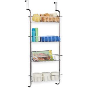 This practical hanging shelf provides lots of storage space with its 4 shelves without taking up too much room itself. Thanks to the 2 included hooks, the shelf can be simply hung from any door or even your refrigerator. Simple and quick assembly without drilling. Use the door rack to store bath utensils, kitchenware, detergents, towels or magazines. Save space and keep it organized. The modest design with the polished shiny silver colour matches any interior perfectly. Hanging Chrome Shelf Details • Size H x W x D: approx. 112 x 45 x 23 cm • Weight: approx. 2 kg • Material: Chrome-plated iron • Colour: Shiny silver • For doors up to 4 cm thick Size of Wall Shelf • Shelves H x W x D: 7.5 x 42 x 15 cm • Distance between legs: app. 18.5 cm • Size hooks H x W x D: 12.5 x 3 x 6 cm • Distance between legs: app. 2 cm • Distance from top tray to upper door hook: app. 21 cm Door Rack for Bathroom or Kitchen • No drilling - The hanging shelf is simply hung from a door and can be used right