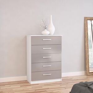 Elegant, stylish and sophisticated are the first three words that come to mind when it comes to the Lynx White and Grey 5 Drawer Chest. This sleek and modern chest is finished to the highest gloss finish to provide you with the perfect addition to your bedroom design. You get to enjoy a superior storage solution to reduce clutter in the bedroom, while enjoying a sleek design in beautiful white with grey to provide an eye-catching item of furniture.. The Lynx White and Grey 5 Draw Chest works in any bedroom design offering a modern and contemporary addition; along with superior versatility, functionality and practicality when it comes to your unique storage needs. The chest is finished in beautiful high gloss white with sleek grey drawers and finished with silver detailed horizontal handles. It is also available in a choice of colours for added convenience and adaptability.. Superior Functionality. This 5-drawer chest is made from the finest quality MDF offering a strong and durable storage solution, which will offer years of enjoyment. It boasts a very high gloss sleek finish which is guaranteed to work in your bedroom space with ease. The bold and strong silver detailing is that perfect finishing touch that makes the Lynx range such a top choice.. If it's storage you are after, then you cannot go wrong with this modern and stylish chest which boasts five generous sized drawers, each able to hold up to five kilograms. The top of the chest can hold slightly more at 8kg. Once fully assembled the chest is 1090mm high, 766mm wide and 379mm deep. It belongs to a beautiful range of bedroom furniture pieces and works beautifully in conjunction with the rest of the range. The product is part of the Lynx White and Grey Wooden Bedroom Furniture Collection.. .