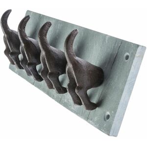 Brand: Homescapes Size: Approx. W 30 x D 6.5 x H 10 cm Colour: Brown Material: Metal - Cast Iron Ideal for holding coats and pet leads or accessories by the door, this contemporary slate and cast iron coat rack features four wagging dog tail coat hooks. Animal Shaped Coat Hooks Part of Homescapes large collection of home storage solutions, this playful puppy-themed coat hook rack is perfect for animal lovers or anyone who fancies a slightly unusual coat hanger. Four brown, cast iron dog tails protrude from a natural slate panel in this quirky coat rack design, providing a great spot to store coats, scarves and, of course, pet accessories. Wall Mounted Coat Rack These wall mounted coat hooks can be fixed to almost any surface; simply attach to your wall or door using the incorporated screw holes. Fixings not included. Due to the solid slate base plate, this coat holder is quite heavy so please take care to ensure it is secured using the correct attachments for your wall type.