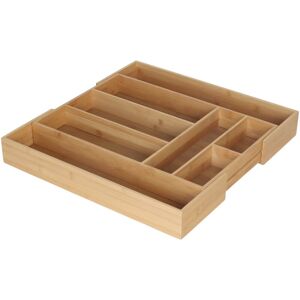 Cluttered kitchen drawers are a thing of the past with this cutlery tray. The drawer insert with 6 main compartments and 2 pull-out compartments offers ample space for cutlery, larger kitchen knives, and various cooking utensils. Thanks to its adjustable width, the cutlery tray insert adapts to different drawer sizes. Made from durable bamboo and MDF, the cutlery tray boasts a simple yet elegant design in a natural finish. Note: Measure your drawer carefully to ensure the tray fits easily. Cutlery tray details - Dimensions when pushed together H x W x D: approx. 6.5 x 33 x 47.5 cm - Max. total width when pulled out: approx. 49.5 cm - Material: bamboo, MDF - Colour: natural Drawer insert with 8 compartments - 2x side pull-out compartments W x D: approx. 46 x 8 cm - 3x long main compartments W x D: approx. 29 x 9.5 cm - 1x large crosswise compartment W x D: approx. 30 x 7 cm - 2x small cross compartments W x D: approx. 15.5 x 7 cm Adjustable cutlery organiser for drawers - This pull-out